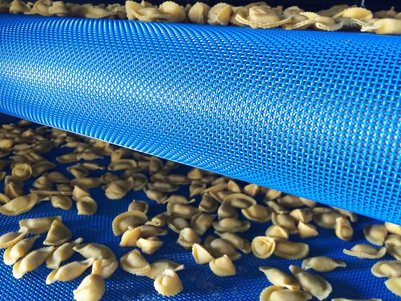 Adecuado para el procesamiento continuo de pasta corta y rellena, consiste principalmente en una estructura robusta de acero inoxidable, una serie de bandas transportadoras de plástico de grado alimentario (polietileno o polipropileno) o de acero inoxidable uno encima del otro para transportar el producto y una zona donde se encuentran las baterías para calefacción y ventilación.